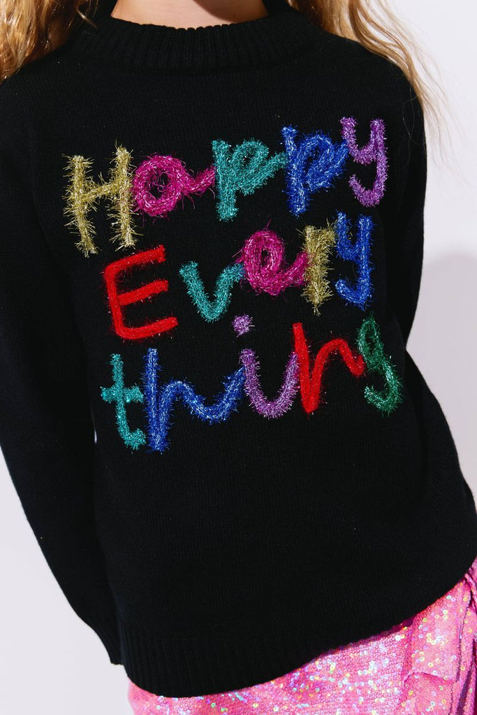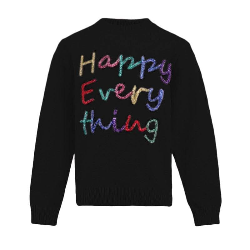 - Make every day a celebration with this vibrant "Happy Everything" sweater featuring bold, glittery lettering.